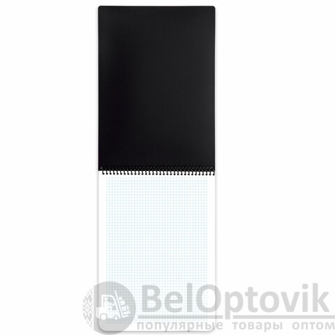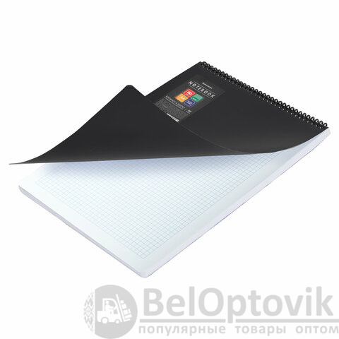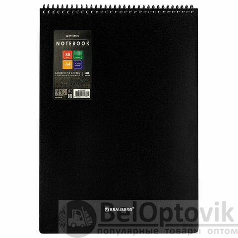 Блокнот формата А4 на спирали содержит 80 листов с линовкой в клетку, что позволяет зафиксировать большой объем нужной информации. Имеет верхнее расположение переплета. Обложка выполнена из пластика, что делает блокнот более износоустойчивым. Внутренний блок состоит из белой офсетной бумаги плотностью 70 г/м2.