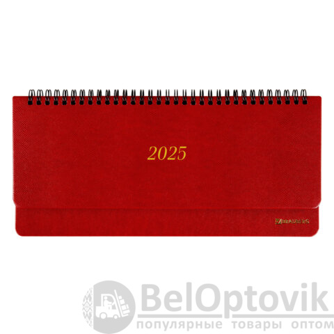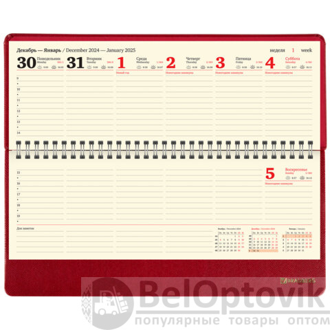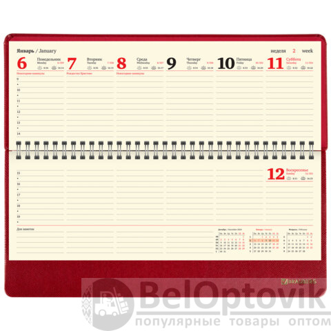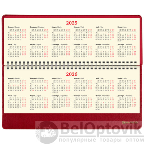 Внутренний блок содержит 60 листов офсетной бумаги кремового цвета плотностью 70 г/м2. Обложка из экокожи красного цвета и твердый переплет обеспечивают долгий срок службы. Для заметок в планинге имеется 11 страниц в конце внутреннего блока. Подходит для горячего тиснения. Скрепление осуществляется с помощью евроспирали. Размер изделия – 305х140 мм.
