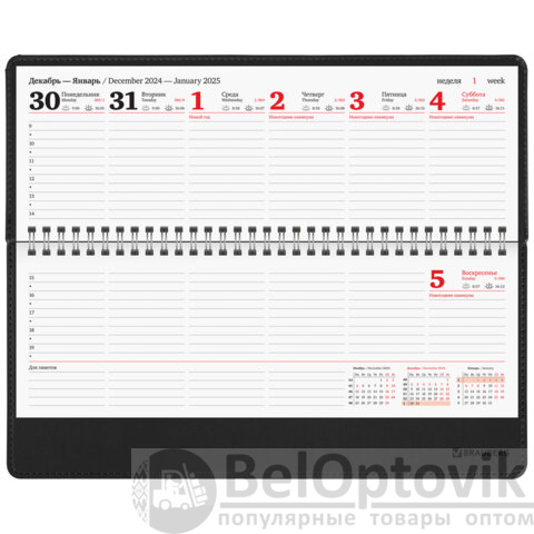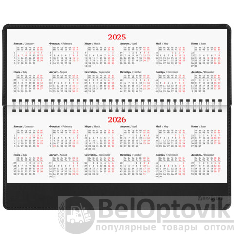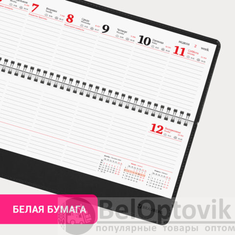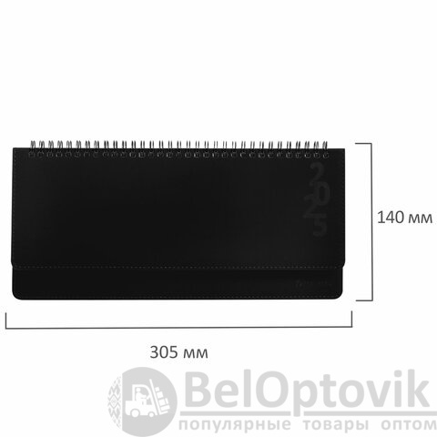 Внутренний блок содержит 60 листов офсетной бумаги белого цвета плотностью 70 г/м2. Обложка из экокожи и твердый переплет обеспечивают долгий срок службы. Для заметок в планинге имеется 11 страниц в конце внутреннего блока. Подходит для горячего тиснения. Скрепление осуществляется с помощью евроспирали. Размер изделия – 305х140 мм.