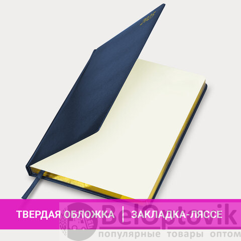 Внутренний блок включает 64 листа кремовой бумаги плотностью 70 г/м2. Благодаря большому формату А4 еженедельник удобно использовать как в офисе, так и на выездных деловых встречах. Твердая обложка, стилизованная под фактурную кожу благородного синего цвета, подходит для горячего тиснения. Дополнением является закладка-ляссе, с помощью которой при необходимости можно быстро открыть еженедельник на нужной странице. Для заметок в еженедельнике имеется 7 страниц в конце внутреннего блока. Еженедельник снабжен обширным справочным материалом.