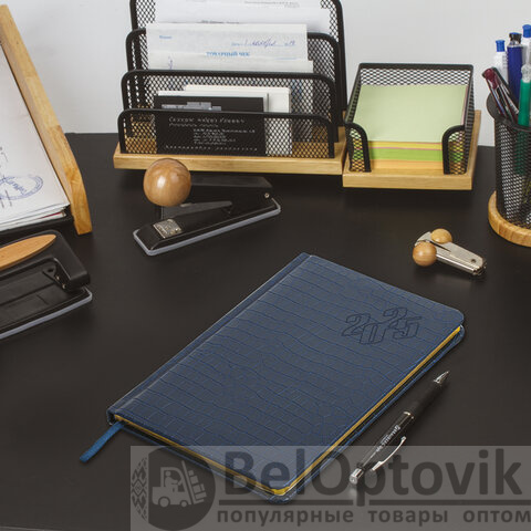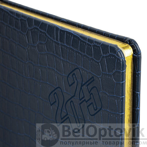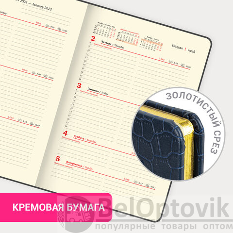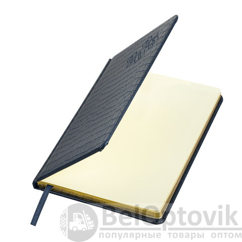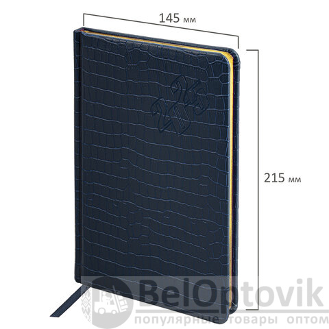 Внутренний блок включает 64 листа тонированной бумаги плотностью 70 г/м2. Благодаря стандартному формату А5 еженедельник удобно использовать как в офисе, так и на выездных деловых встречах. Твердая обложка благородного темно-синего цвета, стилизованная под кожу крокодила, подходит для горячего тиснения. Срез еженедельника фольгирован золотой фольгой, что придает ему особый шарм. Дополнением является закладка-ляссе, с помощью которой при необходимости можно быстро открыть еженедельник на нужной странице. Для заметок в еженедельнике имеется 7 страниц в конце внутреннего блока. Помимо прочего, еженедельник снабжен обширным справочным материалом.