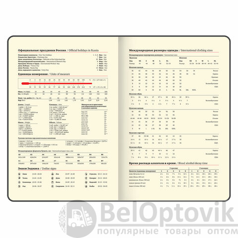 Внутренний блок включает 64 листа тонированной бумаги плотностью 70 г/м2. Благодаря стандартному формату А5 еженедельник удобно использовать как в офисе, так и на выездных деловых встречах. Твердая обложка, стилизованная под кожу рептилии, выполнена в благородном черном цвете и подходит для горячего тиснения. Срез еженедельника фольгирован золотой фольгой, что придает ему особый шарм. Дополнением является закладка-ляссе, с помощью которой при необходимости можно быстро открыть еженедельник на нужной странице. Для заметок в еженедельнике имеется 7 страниц в конце внутреннего блока. Еженедельник снабжен обширным справочным материалом.