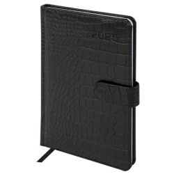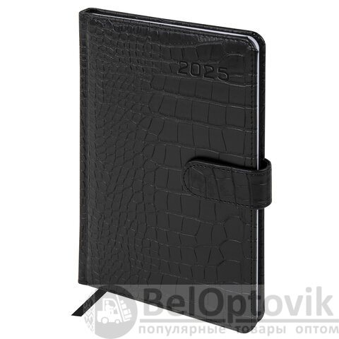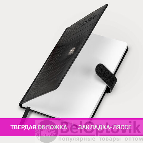 Внутренний блок включает 64 листа белой бумаги плотностью 70 г/м2. Благодаря стандартному формату А5 еженедельник удобно использовать как в офисе, так и на выездных деловых встречах. Твердая обложка, стилизованная под кожу крокодила, фиксируется магнитной застежкой, поэтому еженедельник не откроется в сумке или портфеле и страницы не помнутся. Подходит для горячего тиснения. Дополнением является закладка-ляссе, с помощью которой при необходимости можно быстро открыть еженедельник на нужной странице. Для заметок в еженедельнике имеется 7 страниц в конце внутреннего блока. Еженедельник снабжен обширным справочным материалом. Выполнен в классическом черном цвете.