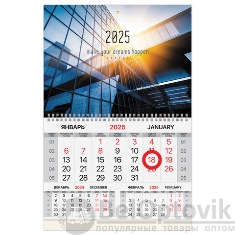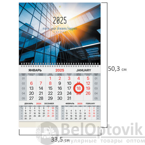 Офисный календарь на 2025 год на гребне. Состоит из 1 блока с календарными сетками на три месяца с магнитным курсором. Блок календаря напечатан на мелованной бумаге плотностью 80 г/м2. Подложка изготовлена из мелованного картона плотностью 250 г/м2. Магнитный курсор-бегунок выделяет текущую дату. Вертикальное расположение. Размер - 33,5х50,3 см.