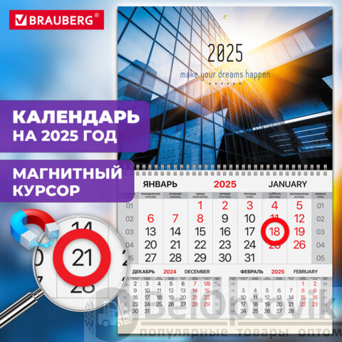 Календарь квартальный на 2025 г., 1 блок, 1 гребень, магнитный курсор, мелованная бумага, BRAUBERG, "Офис", 116084