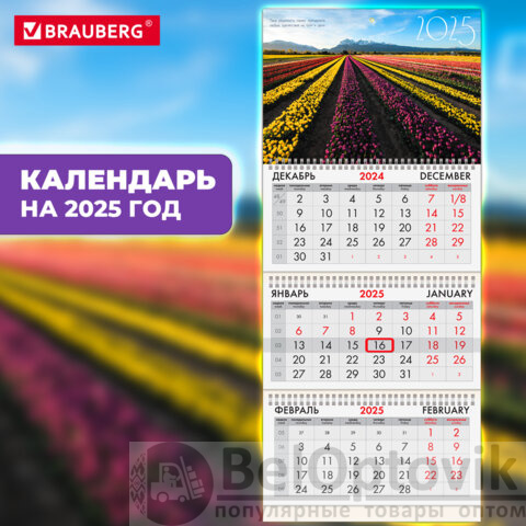 Календарь квартальный на 2025 г., 3 блока, 3 гребня, с бегунком, офсет, BRAUBERG, "Долина цветов", 116098
