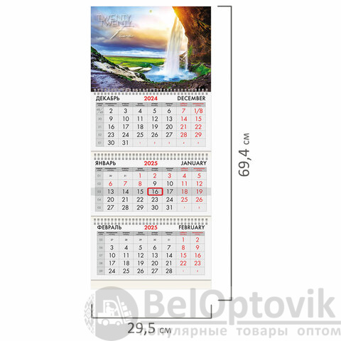 Календарь квартальный на 2025 г., 3 блока, 3 гребня, с бегунком, офсет, BRAUBERG, "Водопад", 116101