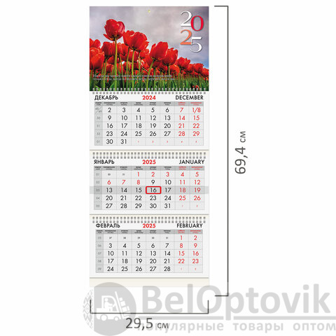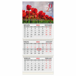 Календарь квартальный на 2025 г., 3 блока, 3 гребня, с бегунком, офсет, BRAUBERG, "Тюльпаны", 116109