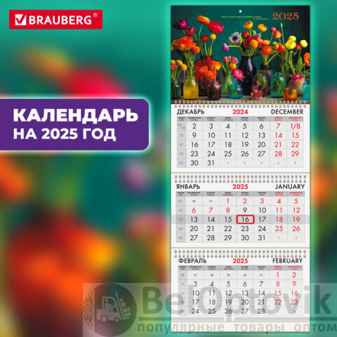 Календарь квартальный на 2025 г., 3 блока, 3 гребня, с бегунком, мелованная бумага, BRAUBERG, "Прекрасные цветы", 116136