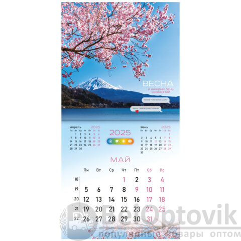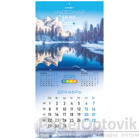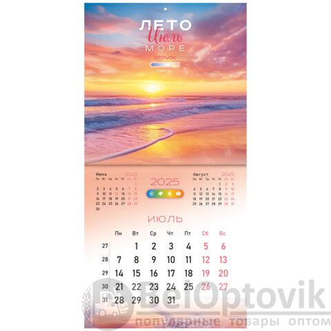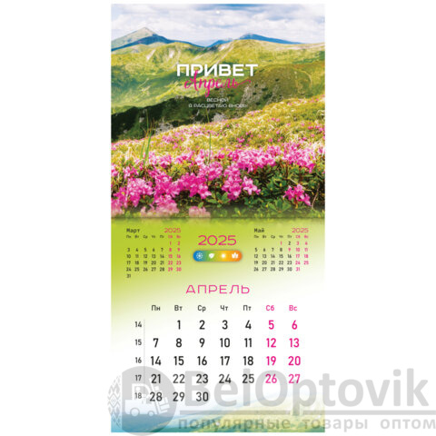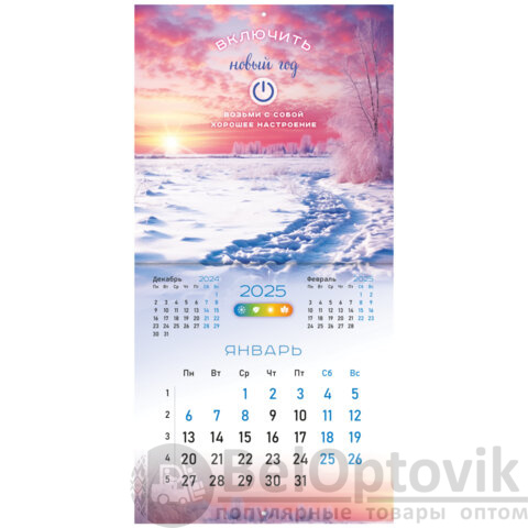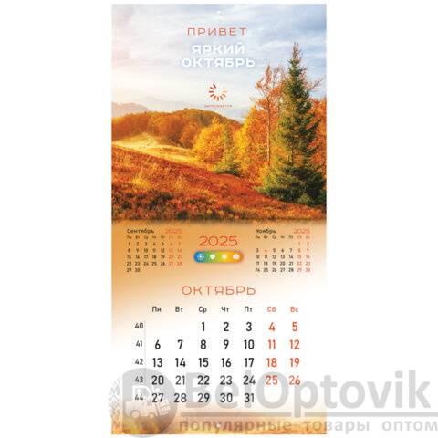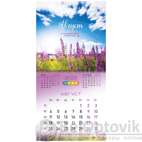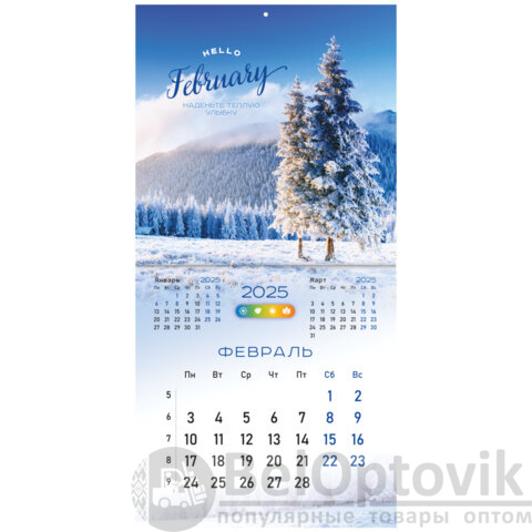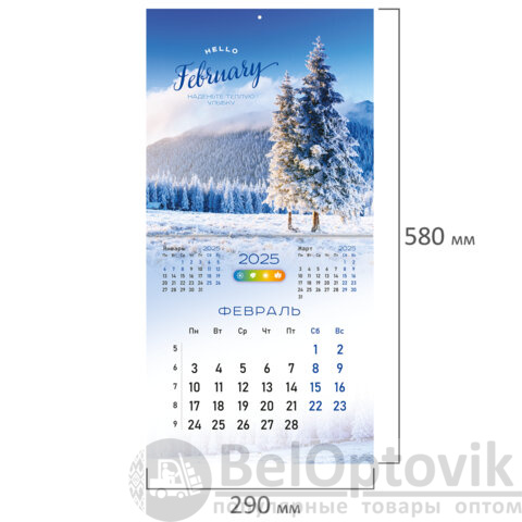 Яркая, красочная картинка дополнена календарной сеткой на месяц. Содержит 12 листов. Блок календаря напечатан на мелованной бумаге плотностью 130 г/м2. Оригинальная обложка изготовлена из мелованной бумаги плотностью 230 г/м2 с матовой ламинацией. Размер – 29х29 см, в развороте – 29х58 см. Дополнен отверстием для удобства крепления. Поставляется в индивидуальной упаковке (полибэг) с европодвесом и прокладкой из гофрокартона, что создает товару дополнительную защиту.
