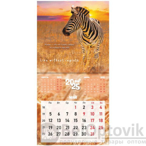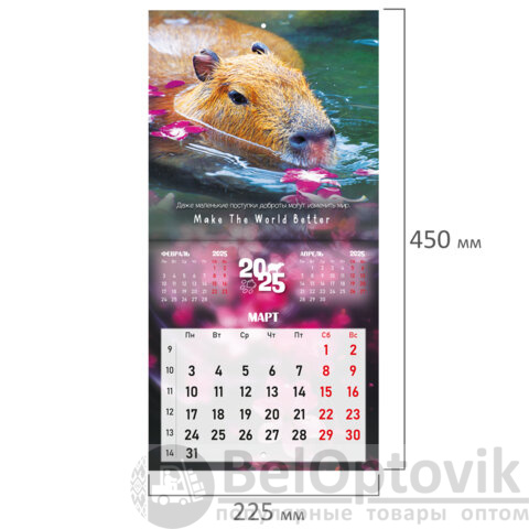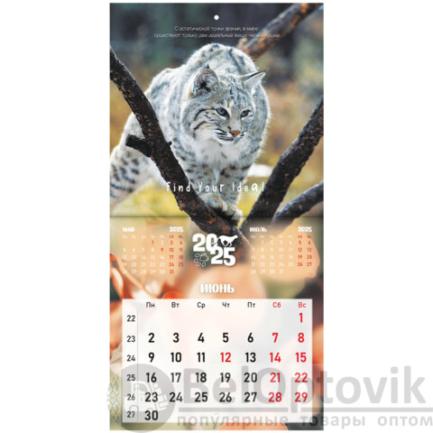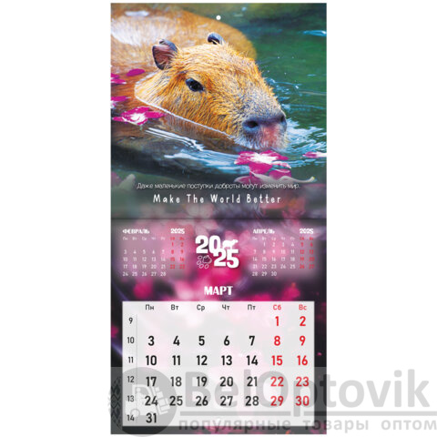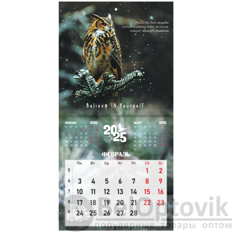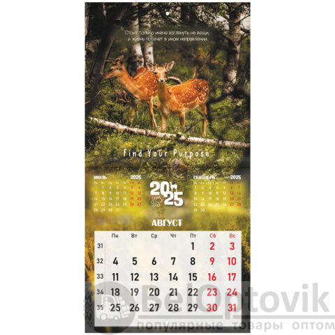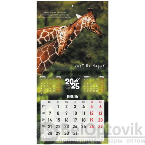 Настенный календарь на скрепке, содержит 12 страниц. Яркая, красочная картинка дополнена календарной сеткой на месяц. Блок календаря напечатан на мелованной бумаге плотностью 130 г/м2. Оригинальная обложка изготовлена из мелованной бумаги плотностью 230 г/м2. Размер – 22,5х22,5 см. Дополнен отверстием для удобства крепления. Поставляется в индивидуальной упаковке (полибэг) с европодвесом и прокладкой из гофрокартона, что создает товару дополнительную защиту.