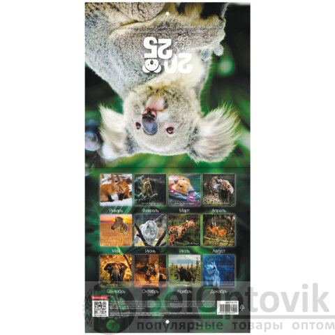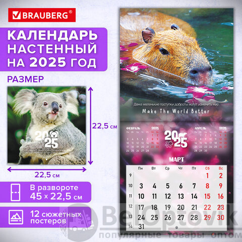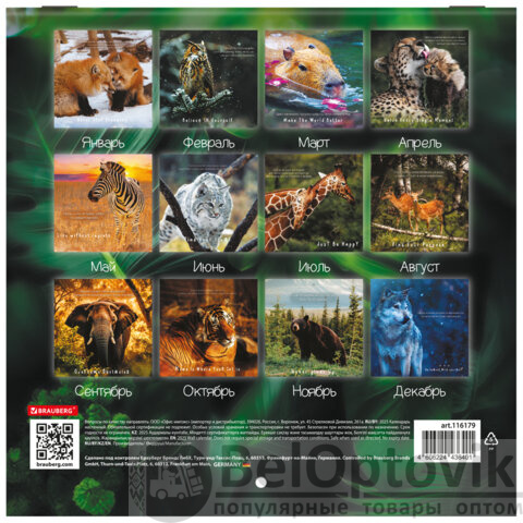Календарь настенный перекидной на 2025 г., BRAUBERG, 12 листов, 22,5х22,5 см, МИНИ, "Дикие животные", 116179