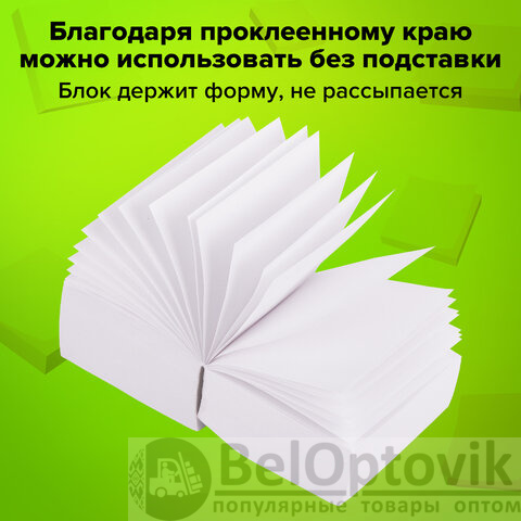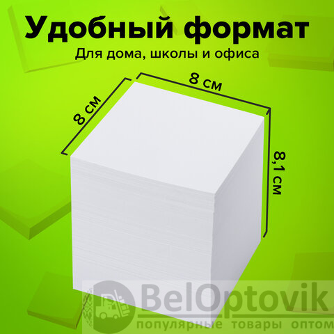 Блок из 1000 листов сложен из квадратных листов размером 8х8 см. Листы изготовлены из высококачественной офсетной бумаги плотностью 60 г/м2 и белизной 90-92%. Блок для записей подходит для письма любыми типами ручек и карандашей. Поставляется в плотной термоусадочной пленке, защищающей при транспортировке. Может использоваться как в пластиковых подставках для настольных органайзерах, так и без подставок, поскольку листы проклеены по одной стороне, что делает блок устойчивым и листы не рассыпаются.