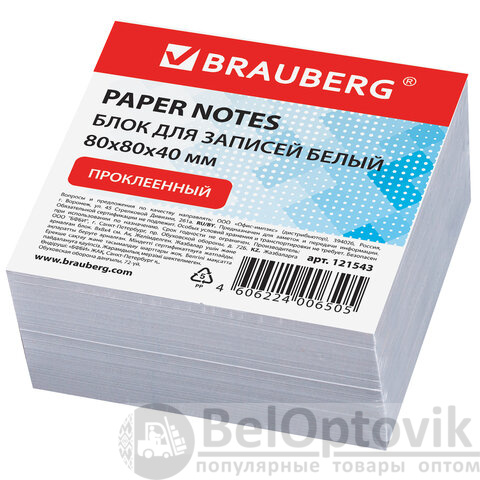 Блок для записей BRAUBERG, проклеенный, куб 8х8х4, белый, белизна 90-92%, 121543