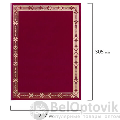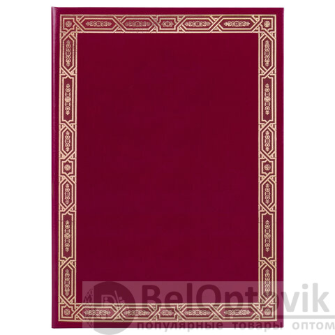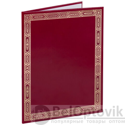 Изготовлена из прочного картона, покрытого бумвинилом. Папка формата А4 универсального назначения выполнена в насыщенном бордовом цвете. На обложке - декоративный орнамент рамки, нанесенный с помощью золотого тиснения. Снабжена лентой для удержания документов (ляссе). Предусмотрено нанесение логотипа.