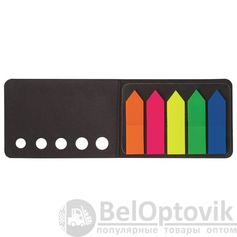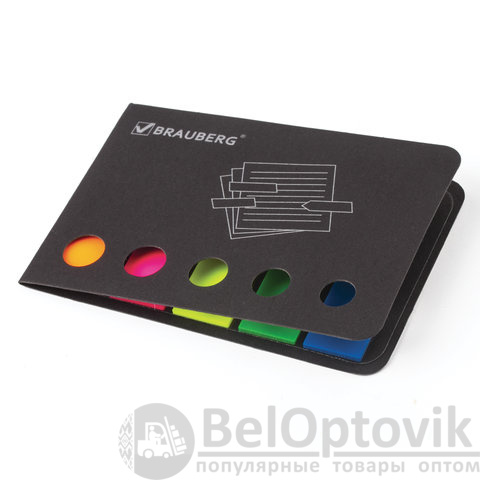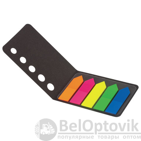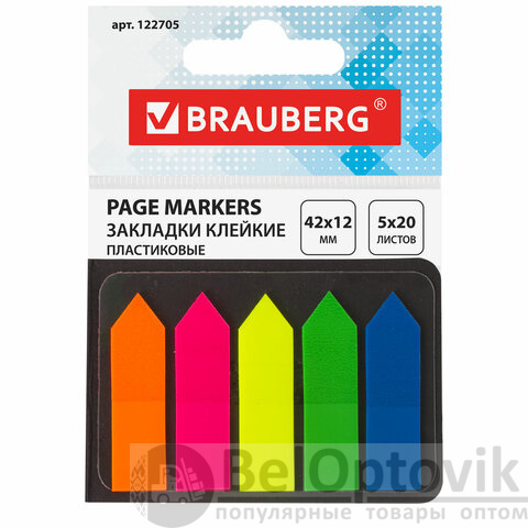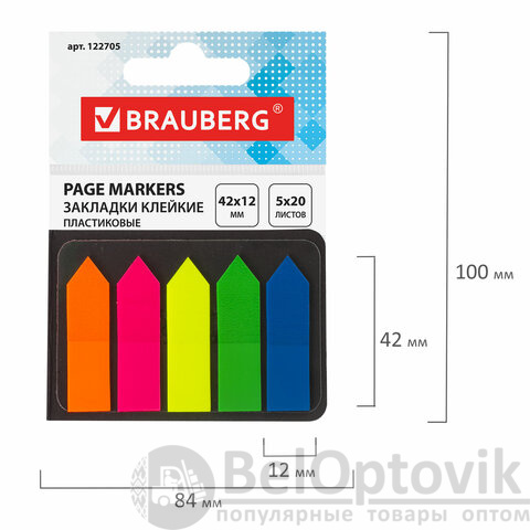 Закладки клейкие неоновые BRAUBERG, 42х12 мм, 100 штук (5 цветов х 20 листов), в картонной книжке, 122705