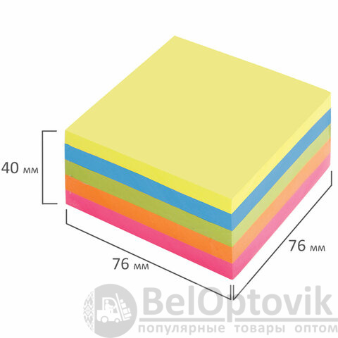 Стикеры 5 неоновых цветов (желтый, розовый, зеленый, оранжевый, малиновый) в форме куба 76х76 мм состоят из 400 листов. Плотность бумаги составляет 75 г/м2. Клейкий слой - 35 Н/м. Легко клеятся к любой поверхности. Не оставляют следов. Упакованы в полиэтиленовую пленку.