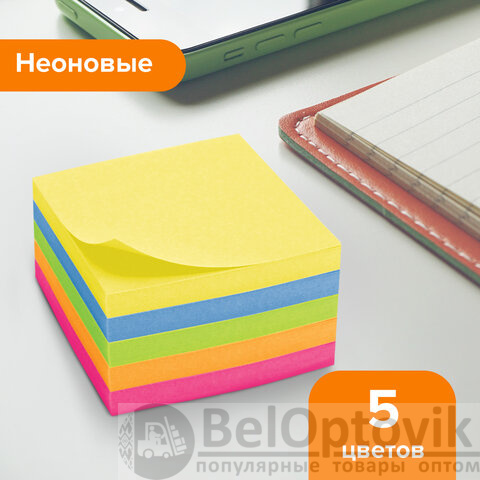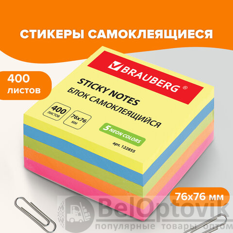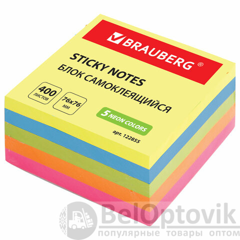 Блок самоклеящийся (стикеры), BRAUBERG, НЕОНОВЫЙ, 76х76 мм, 400 листов, 5 цветов, 122855
