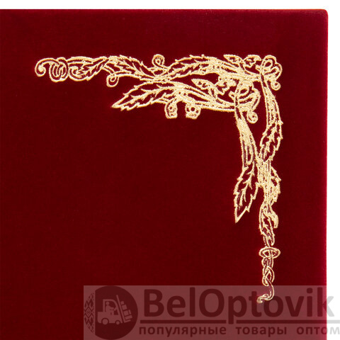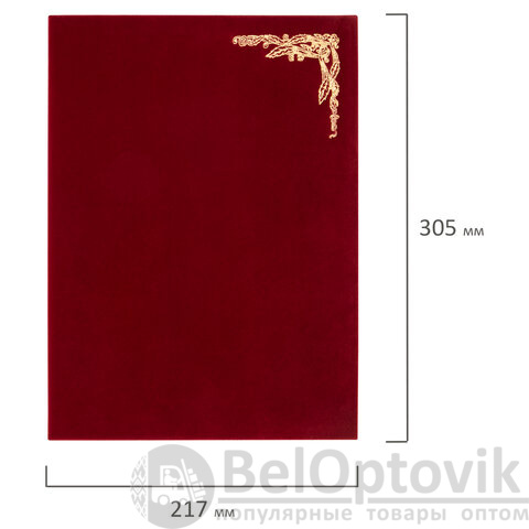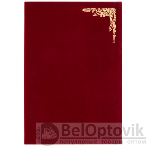 Поздравительная папка с покрытием, которое на ощупь напоминает бархатную ткань. Папка формата А4 универсального назначения выполнена в насыщенном бордовом цвете. На обложке - орнамент, нанесенный с помощью золотого тиснения. Снабжена лентой для удержания документов (ляссе). Предусмотрено нанесение логотипа.