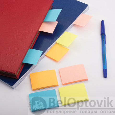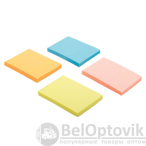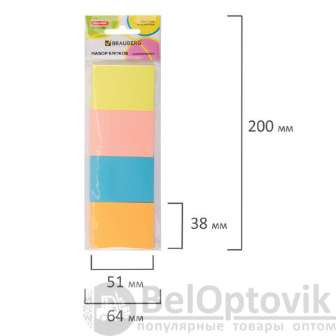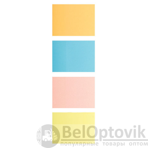 Стикеры 4 неоновых цветов (желтый, розовый, голубой, оранжевый) в форме прямоугольника 38х51 мм состоят из 4 блоков по 50 листов. Плотность бумаги составляет 75 г/м2. Клейкий слой - 35 Н/м. Легко клеятся к любой поверхности. Не оставляют следов. Упакованы в полиэтиленовый пакет с европодвесом.