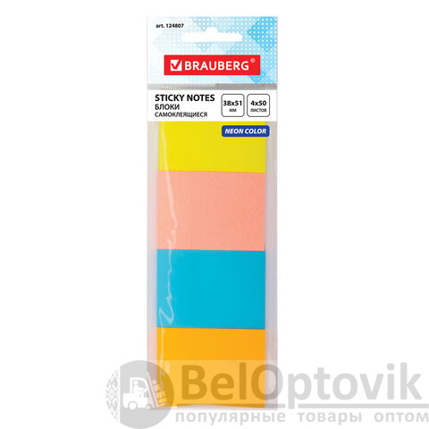 Блок самоклеящийся (стикеры), BRAUBERG, НЕОНОВЫЙ, 38х51 мм, 4 цвета х 50 листов, 124807
