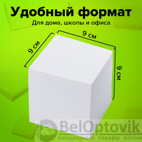 Блок высотой 9 см сложен из квадратных листов размером 9х9 см. Листы изготовлены из высококачественной офсетной бумаги плотностью 65 г/м2 и белизной 90-92%. Блок для записей подходит для письма любыми типами ручек и карандашей. Поставляется в плотной термоусадочной пленке, защищающей при транспортировке. Для повышения удобства рекомендуется использование в пластиковых подставках и настольных органайзерах.