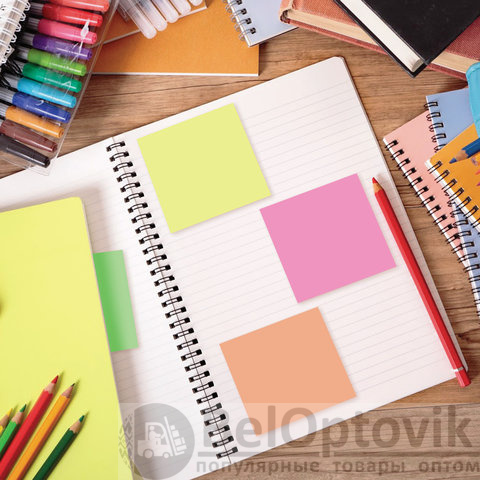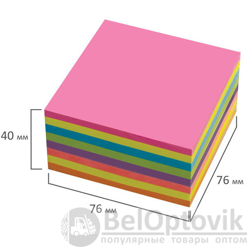 Стикеры 8 неоновых цветов (желтый, розовый, зеленый, голубой, фиолетовый оранжевый, малиновый) в форме куба 76х76 мм состоят из 400 листов. Плотность бумаги составляет 75 г/м2. Клейкий слой - 35 Н/м. Легко клеятся к любой поверхности. Не оставляют следов. Упакованы в полиэтиленовую пленку.