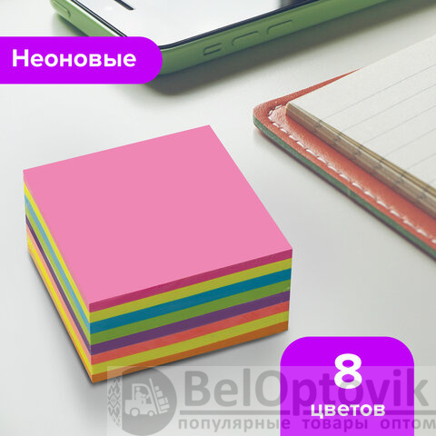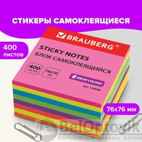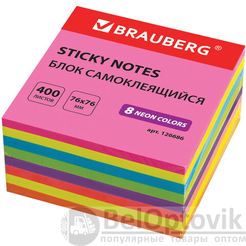 Блок самоклеящийся (стикеры), BRAUBERG, НЕОНОВЫЙ, 76х76 мм, 400 листов, 8 цветов, 126686