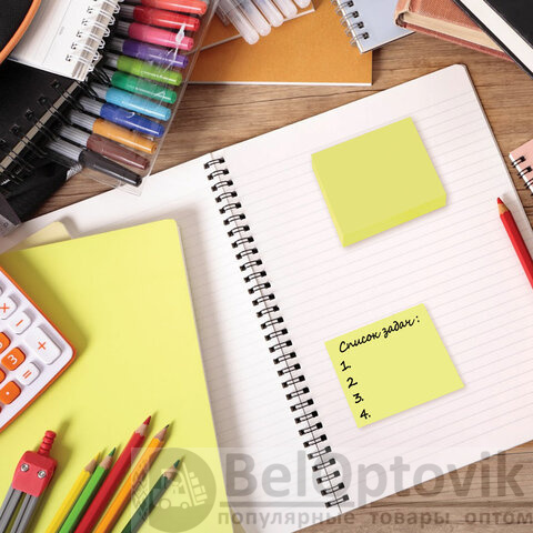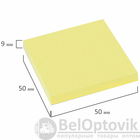 Стикеры жёлтого пастельного цвета в форме квадрата 50х50 мм состоят из 100 листов. Плотность бумаги составляет 75 г/м2. Клейкий слой - 22 Н/м. Легко клеятся к любой поверхности. Не оставляют следов. Упакованы в полиэтиленовую пленку.