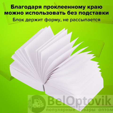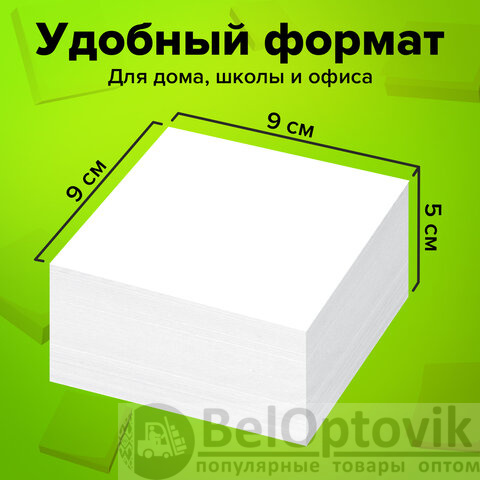Блок высотой 5 см сложен из квадратных листов размером 9х9 см. Листы изготовлены из высококачественной офсетной бумаги плотностью 60 г/м2 и белизной 90-92%. Блок для записей подходит для письма любыми типами ручек и карандашей. Поставляется в плотной термоусадочной пленке, защищающей при транспортировке. Может использоваться как в пластиковых подставках для настольных органайзерах, так и без подставок, поскольку листы проклеены по одной стороне, что делает блок устойчивым и листы не рассыпаются.