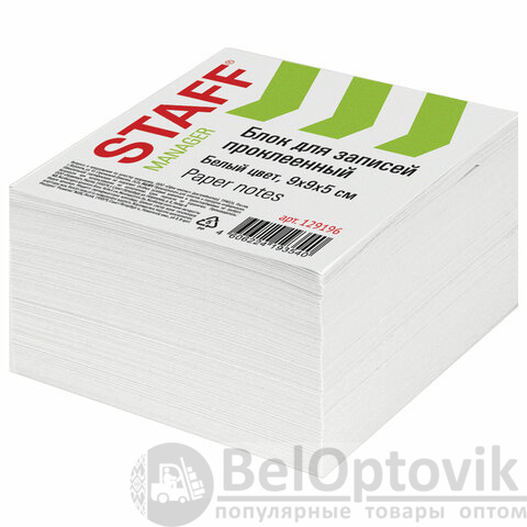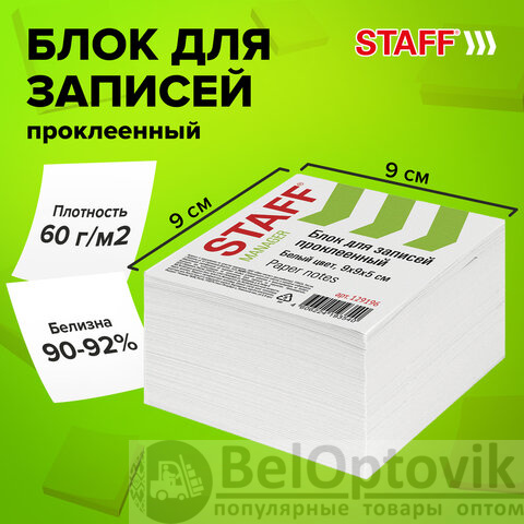Блок для записей STAFF проклеенный, куб 9х9х5 см, белый, белизна 90-92%, 129196