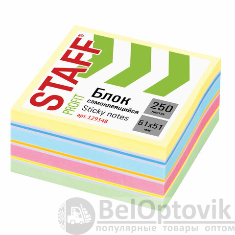 Блок самоклеящийся (стикеры) STAFF, ПАСТЕЛЬНЫЙ, 51х51 мм, 250 листов, 8 цветов, 129348