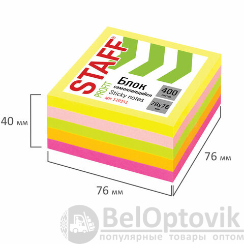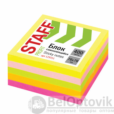 Блок самоклеящийся (стикеры) STAFF НЕОНОВЫЙ, 76х76 мм, 400 листов, 5 цветов, 129351