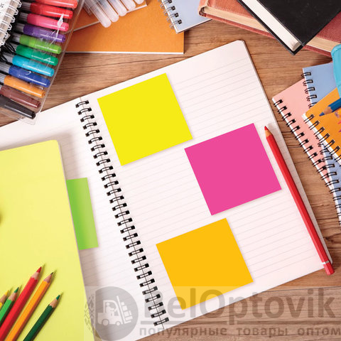 Стикеры 5 неоновых цветов (желтый, розовый, зелёный, оранжевый, малиновый) в форме куба 76х76 мм состоят из 400 листов. Плотность бумаги составляет 75 г/м2. Клейкий слой - 22 Н/м. Легко клеятся к любой поверхности. Не оставляют следов. Упакованы в полиэтиленовую пленку.