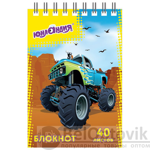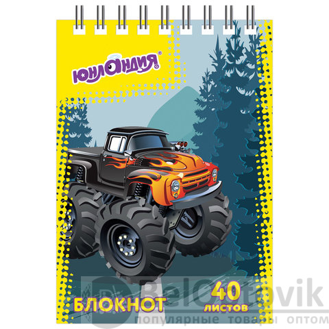 Блокнот МАЛЫЙ ФОРМАТ А7 75х105 мм, 40 л., гребень, картон, клетка, ЮНЛАНДИЯ, "Монстр-трак" / "Футбол", 129859