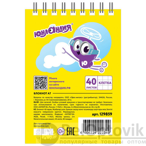 Блокнот формата А7 на евроспирали содержит 40 листов с линовкой в клетку. Имеет верхнее расположение переплета. Обложка выполнена из мелованного картона плотностью 200 г/м2. Внутренний блок состоит из белой офсетной бумаги плотностью 60 г/м2.