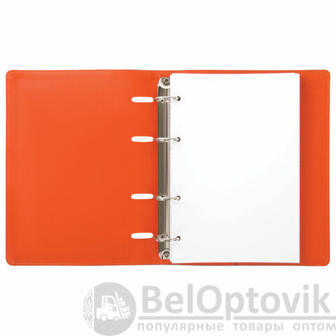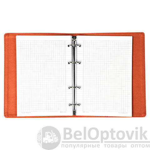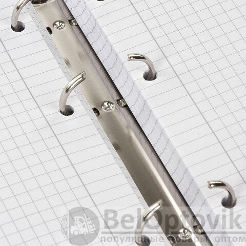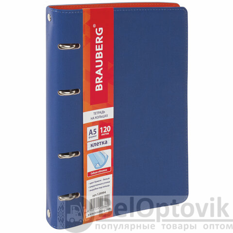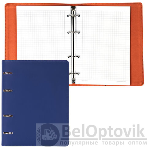 Блок состоит из 120 листов офсетной бумаги белого цвета плотностью 70 г/м2. Линовка - клетка с полями. Мягкая интегральная обложка с прошивкой по периметру и вырубкой под кольца выполнена из износоустойчивого материала с текстурой под гладкую кожу. Цвета обложки выполнены на контрасте - верхний синий цвет, внутри обложка красного цвета. Формат А5 является стандартным и обеспечивает комфортное ношение в рюкзаке/ранце или папке. Оборудована кольцевым механизмом с 4-мя кольцами для подшивки сменных блоков, что позволит носить на учебу/работу всего одну тетрадь с возможностью добавлять и менять листы. Полезный диаметр колец - 25 мм.