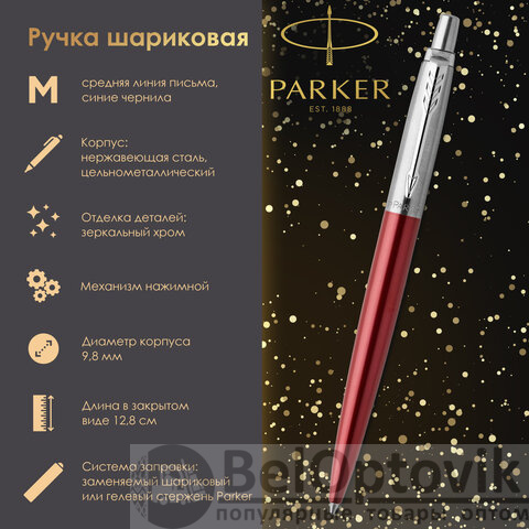Ручка шариковая PARKER "Jotter Core Kensington Red CT", корпус красный, детали хром, синяя, 1953187