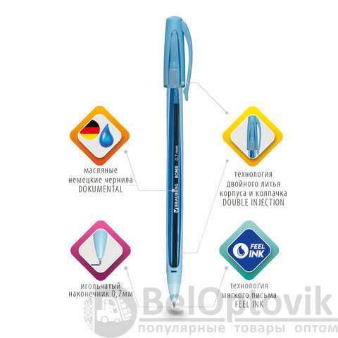Модель изготовлена из высококачественных материалов, сменный стержень заправлен немецкими чернилами на масляной основе DOKUMENTAL синего цвета. Удобный прорезиненный корпус – double injection technology. Диаметр пишущего узла 0,7 мм создает ровную линию письма 0,35 мм. Корпус выполнен в пастельных цветах ассорти. Удобный стакан для размещения ручек в розничном магазине.