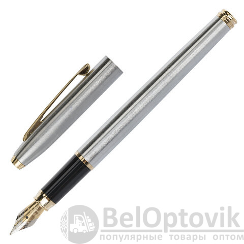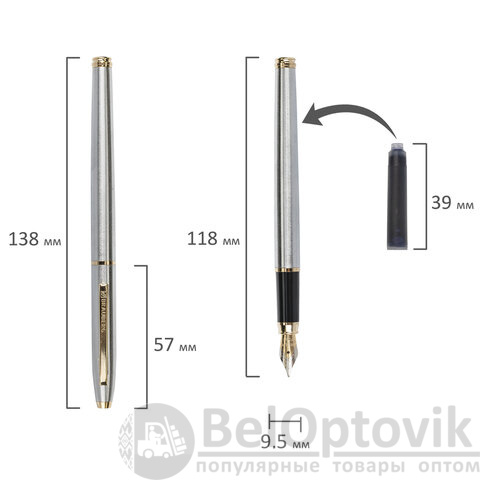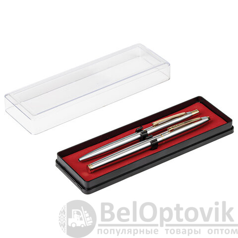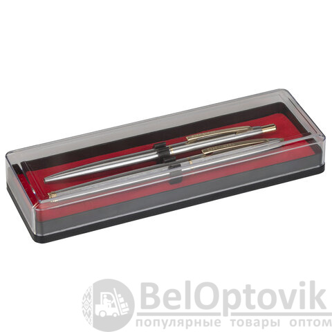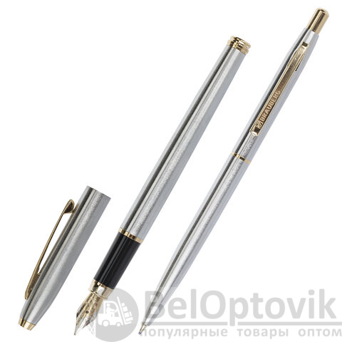 В набор ручек бизнес-класса входят: стильные модели перьевой и шариковой ручек с корпусом из металла серебристого цвета и золотистыми деталями. Синий цвет чернил. Диаметр пишущего узла шариковой ручки 1,0 мм создает ровню линию письма, равную 0,5 мм. Диаметр пишущего узла перьевой ручки 0,5 мм создает ровню линию письма, равную 0,7 мм. Поставляется в фирменной упаковке.