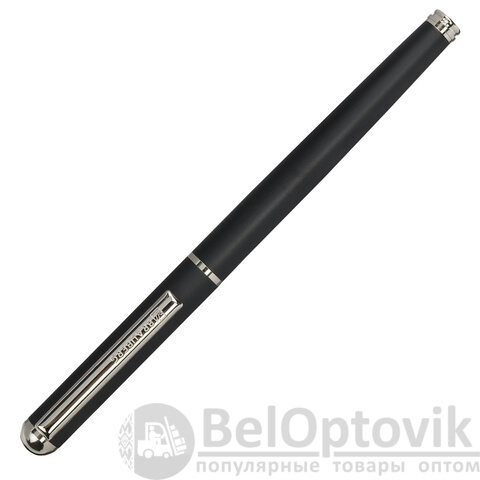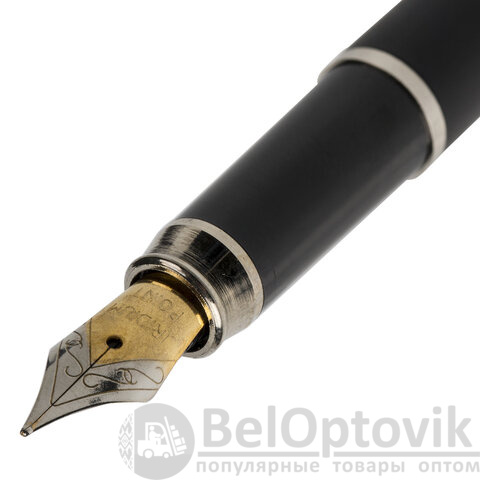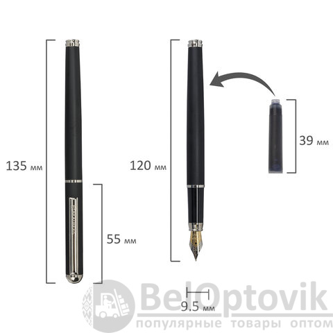 Стильная модель перьевой ручки с корпусом из металла черного цвета и хромированными деталями. Синий цвет чернил, иридиевое перо украшено гравировкой. Диаметр пишущего узла 0,5 мм. Тип пера M (Medium) – средняя ширина линии. Размер картриджа – 39 мм.