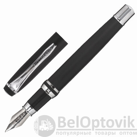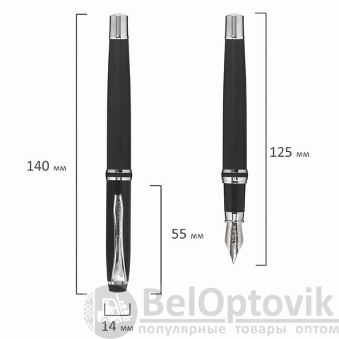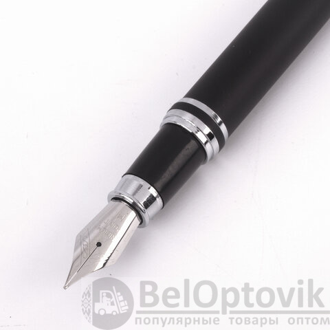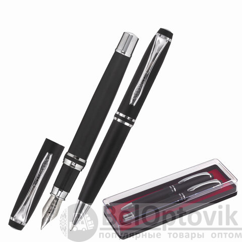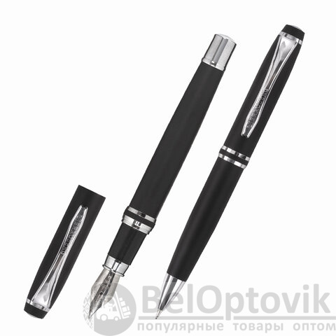 В набор ручек бизнес-класса входят: стильные модели перьевой и шариковой ручек с корпусом из металла черного цвета и серебристыми деталями. Синий цвет чернил. Диаметр пишущего узла шариковой ручки 1,0 мм создает ровню линию письма, равную 0,5 мм. Диаметр пишущего узла перьевой ручки 0,5 мм создает ровню линию письма, равную 0,25 мм. Поставляется в фирменной упаковке.