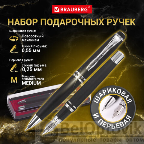 Набор ручек подарочных BRAUBERG Duetto, СИНИЕ, 2 шт.: шариковая, перьевая, черный с хромированными деталями, 143478