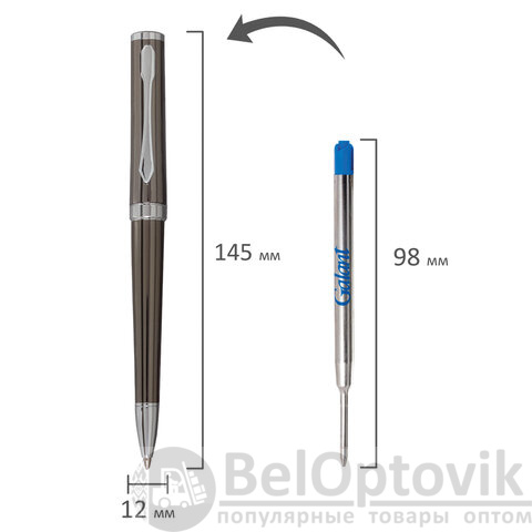 Классическая модель ручки с корпусом из латуни цвета оружейного металла с серебристыми деталями. Синий цвет чернил; длина стержня составляет 98 мм, а диаметр пишущего узла - 0,7 мм. Поставляется в индивидуальном подарочном футляре. Подходит для гравировки.