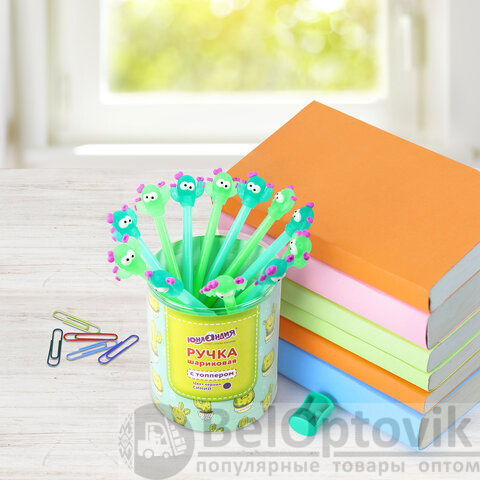 Ручка с топпером шариковая ЮНЛАНДИЯ "Цветущий кактус", корпус ассорти, СИНЯЯ, пишущий узел 0,7 мм, 143781