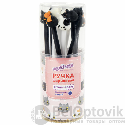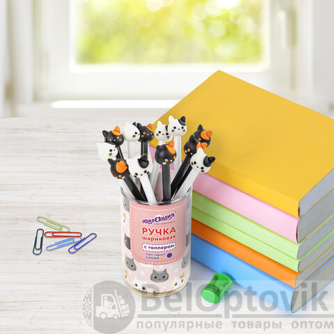 Ручка с топпером шариковая ЮНЛАНДИЯ "Кошка", корпус ассорти, СИНЯЯ, пишущий узел 0,7 мм, 143804