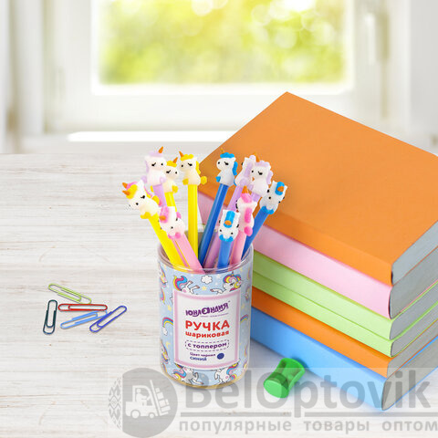 Ручка с топпером шариковая ЮНЛАНДИЯ "Единорог", корпус ассорти, СИНЯЯ, пишущий узел 0,7 мм, 143805