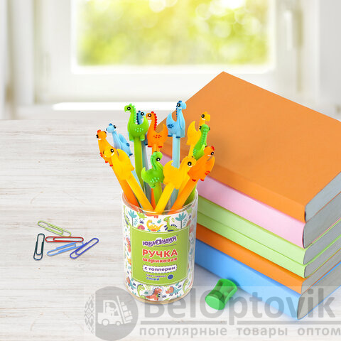Ручка с топпером шариковая ЮНЛАНДИЯ "Динозаврик", корпус ассорти, СИНЯЯ, пишущий узел 0,7 мм, 143809