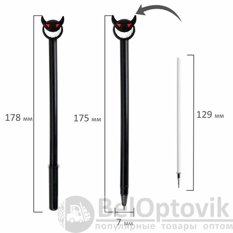 Шариковая ручка серии FUNNY YUMMY с контрастным черным корпусом и оригинальным дизайном топперов в виде чертёнка. Благодаря привлекательному дизайну ее не захочется выпускать из рук, а чернила на масляной основе обеспечат мягкое плавное письмо. Диаметр игольчатого пишущего узла, равный 0,7 мм, создает линию письма, равную 0,35 мм. Длина сменного стержня составляет 129 мм. Цвет чернил - синий.