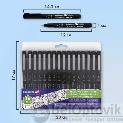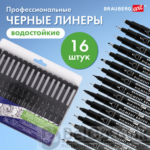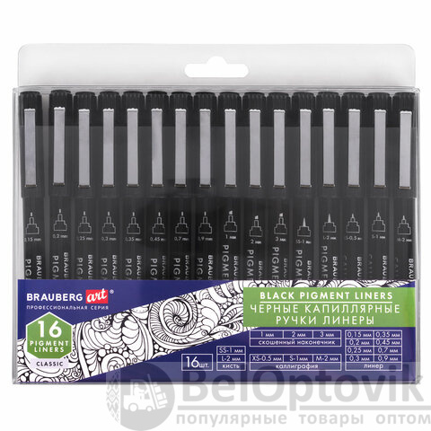 Капиллярные ручки линеры 16 шт. черные, 0,15-3,0 мм, BRAUBERG ART CLASSIC, 143946